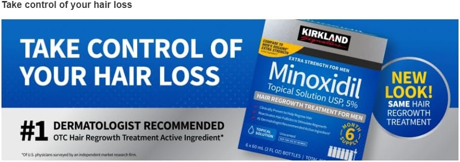KIRKLAND Signature Minoxidil 5% Hair Regrowth Treatment for Men | 6 Months Supply | Topical Solution | Extra Strength | Clinically Proven | Unscented Drops | Dropper Included