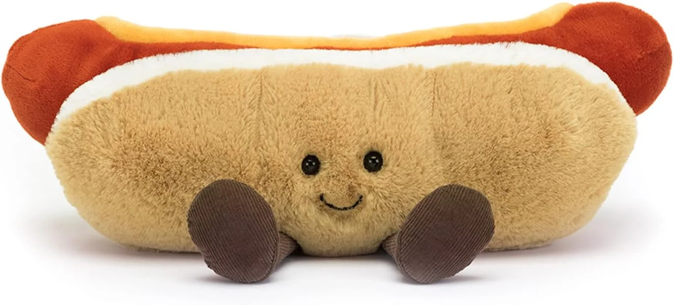 - Amuseables Hot Dog: This smiling hot dog stuffed toy fits perfectly in a picnic basket or a packed lunch for an extra serving of love. Amuseables Hot Dog has a soft beige and white bun, a bright red frankfurter covered in mustard, and cocoa cord boots.