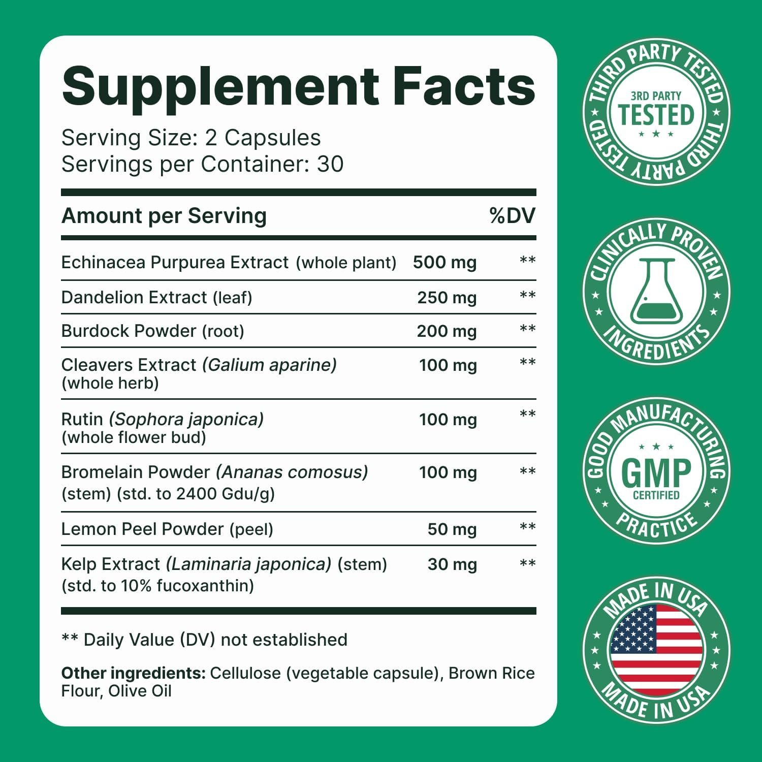 - Comprehensive Herbal Lymphatic Formula: Formulated with echinacea, dandelion extract, burdock root, cleavers extract, rutin, bromelain, lemon powder, and kelp extract. These botanicals are commonly used in lymphatic support and detox-style supplements to create a complete, plant-based blend.