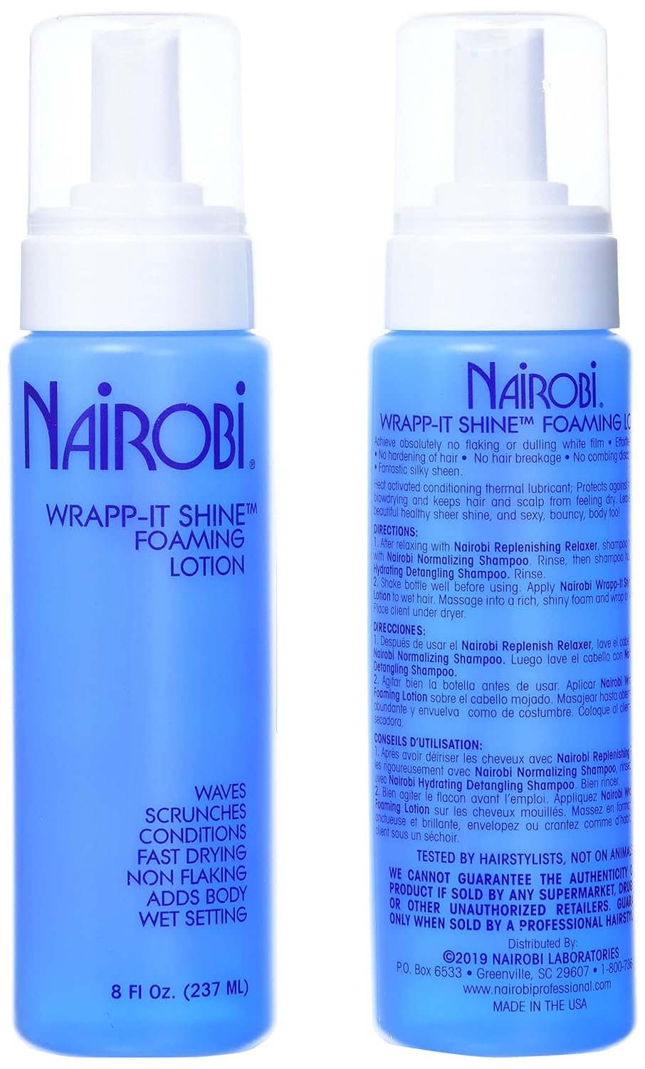 CS PK: 12 / Size: 8 oz. You will love the versatility and performance. Your clients will love the feel. Saves drying time, prevents hardening of hair and hair breakage, eliminates combing discomfort for client. Adds fantastic silky sheen instantly. – Waves – Scrunches – Conditions – Fast Drying – Non flaking – Adds Body – Wet setting Achieve absolutely no flaking or dulling white film – Effortless comb-outs – No hardening of hair – No hair breakage – No combing discomfort for client – Fantastic silky sheen. Heat activated conditioning thermal lubricant; protects against hot curling and blow-drying and keeps hair and scalp from feeling dry. Leaves hair with a beautiful healthy sheer shine, and sexy, bouncy, body, too! Directions: 1) After relaxing with Nairobi replenishing relaxer shampoo hair thoroughly with our Normalizing Shampoo. Then shampoo hair with Nairobi Hydrating Detangling Shampoo. 2) Shake bottle well before using. Apply wrap-it shine foaming lotion to wet hair. Massage into a rich shiny foam and wrap or wave as usual, place client under dryer. Tested by hairstylist, not on animals