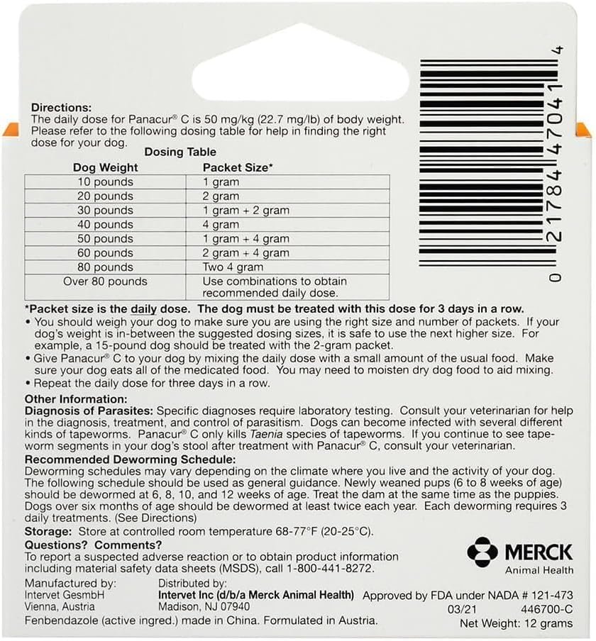 Panacur C Canine Dewormer, Net Wt. 12 Grams, Package Contents Three, 4 Gram Packets (4-(Pack))