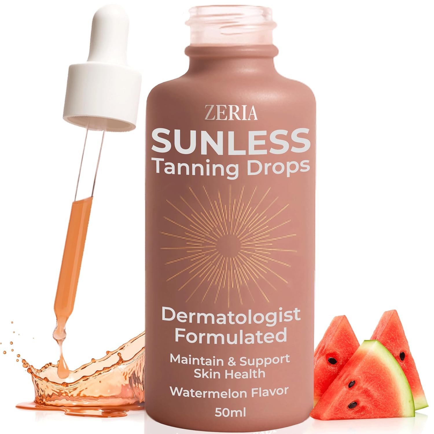 Zeria Tanning Drops to Drink – Sunless Tanning Drops for Face & Body – Vegan, Edible Self Tanner with Beta-Carotene – Natural Glow & Melanin Booster – Watermelon Flavor – 50mL